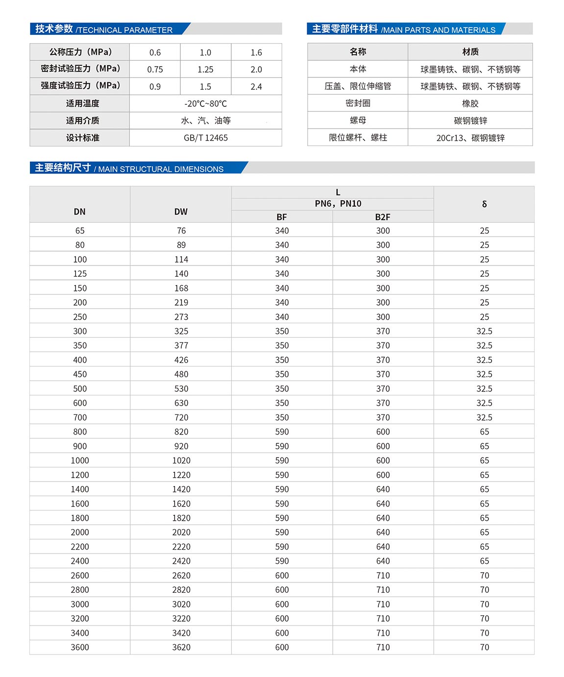 松套限位補(bǔ)償接頭安裝在管道上后,擰緊螺母,起到密封和連接作用。當(dāng)溫度變化時,管子能在接頭中間自由地伸縮,當(dāng)?shù)鼗鲁?、偏斜,它均能確保密封無滲漏,從而達(dá)到自動補(bǔ)償之目的。