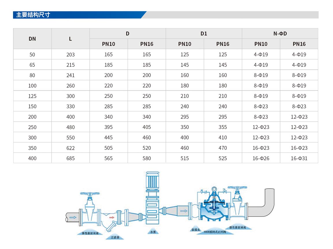 具有開啟和關閉速度調(diào)控的逆止閥,于啟動或停止抽水機運轉時,可配合現(xiàn)場調(diào)節(jié)至開啟或關閉速度??捎糜诟邔咏ㄖ?,減少水錘及水聲現(xiàn)象產(chǎn)生,以達安靜關閉之效果。 公稱壓力∶PNI0、PNI6、PN25 隔膜式∶DN50~DN500