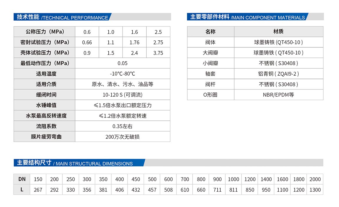 4、安裝在水泵出口管道上,具有關(guān)閥啟泵、關(guān)閥停泵(停泵無水錘)、非人為意外停泵時(shí)防止水錘破壞等功能,關(guān)閉時(shí)間可調(diào)。
