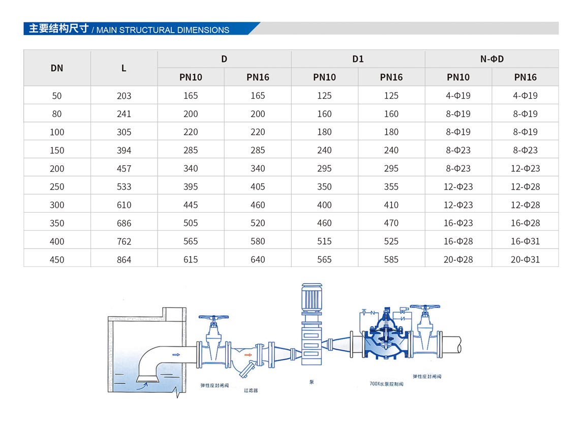 700X水泵控制閥,是一種安裝在高層建筑以及其他給水系統(tǒng)的水泵出口處,防止介質(zhì)倒流的逆止類閥門。當(dāng)水泵即將停止供水前,閥門先行緩幔關(guān)閉90%左右,防止突然停泵而產(chǎn)生的水錘和水擊聲:當(dāng)水泵完全停止后,閥門再完全關(guān)閉,防止泵出的水回流,有效地保護(hù)水泵,免受回流的沖擊而產(chǎn)生反轉(zhuǎn)。該產(chǎn)品是水泵出口必不可少的保護(hù)裝置。閥門呈流線型設(shè)計(jì),通過電磁閥的導(dǎo)控實(shí)現(xiàn)準(zhǔn)確的啟閉,使用安全可靠,有效地防止水錘和水擊聲,使用壽命長,安裝、維修方便。